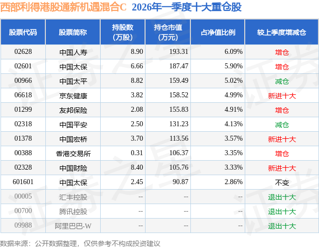 从基金规模来看,西部利得港股通新机遇混合C基金2026年一季度公布的基金规模为0.19亿元,较上一期规模1076.21万元变化了782.92万元,环比变化了72.75%。该基金最新一期资产配置为:股票占净值比82.83%,债券占净值比2.21%,现金占净值比15.37%。从基金持仓来看,该基金当季前十大股票仓位达44.15%,第一大重仓股为中国人寿(02628),持仓占比为6.09%。