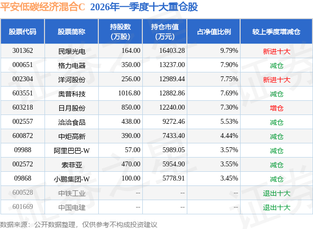 从基金规模来看,平安低碳经济混合C基金2026年一季度公布的基金规模为6.22亿元,较上一期规模3.82亿元变化了2.4亿元,环比变化了62.7%。该基金最新一期资产配置为:股票占净值比88.11%,无债券类资产,现金占净值比11.0%。从基金持仓来看,该基金当季前十大股票仓位达60.97%,第一大重仓股为民爆光电(301362),持仓占比为9.79%。