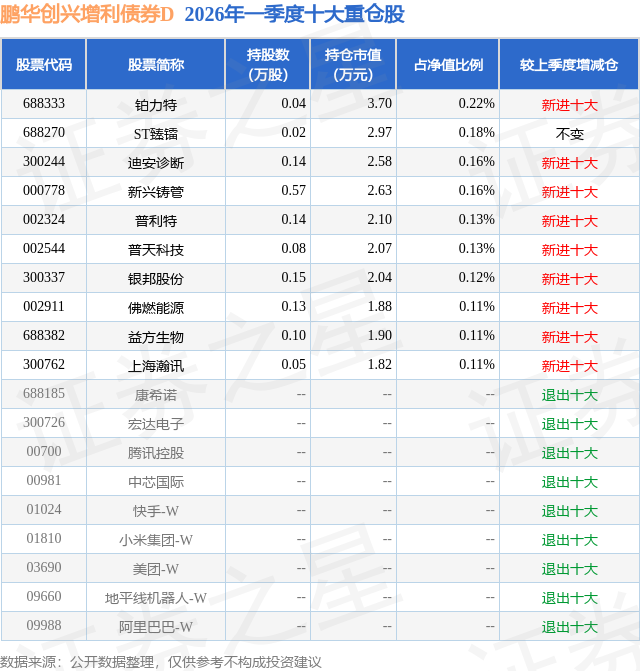 证券之星消息,日前鹏华创兴增利债券D基金公布一季报,2026年一季度最新规模0.11亿元,季度净值涨幅为0.44%。