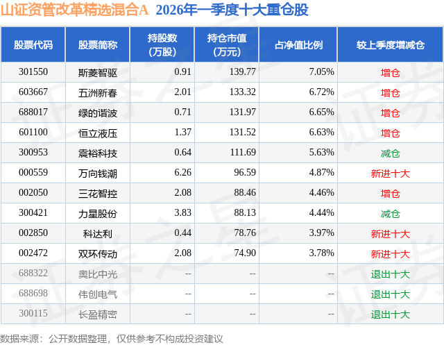 从基金规模来看,山证资管改革精选混合A基金2026年一季度公布的基金规模为0.18亿元,较上一期规模2908.71万元变化了-1118.97万元,环比变化了-38.47%。该基金最新一期资产配置为:股票占净值比89.75%,无债券类资产,现金占净值比10.38%。从基金持仓来看,该基金当季前十大股票仓位达54.2%,第一大重仓股为斯菱智驱(301550),持仓占比为7.05%。