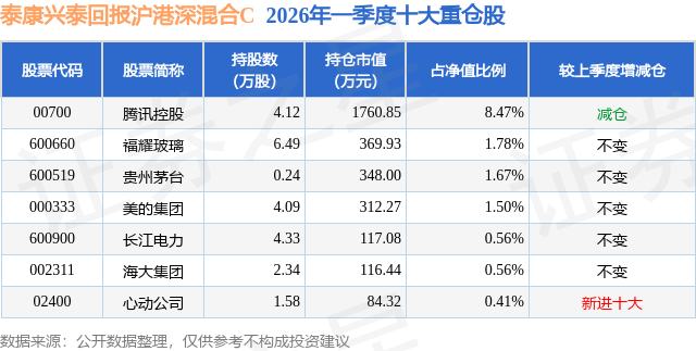 从基金规模来看,泰康兴泰回报沪港深混合C基金2026年一季度公布的基金规模为0.04亿元,较上一期规模979.96万元变化了-590.37万元,环比变化了-60.24%。该基金最新一期资产配置为:股票占净值比14.96%,债券占净值比98.11%,现金占净值比0.78%。从基金持仓来看,该基金当季前十大股票仓位达14.95%,第一大重仓股为腾讯控股(00700),持仓占比为8.47%。