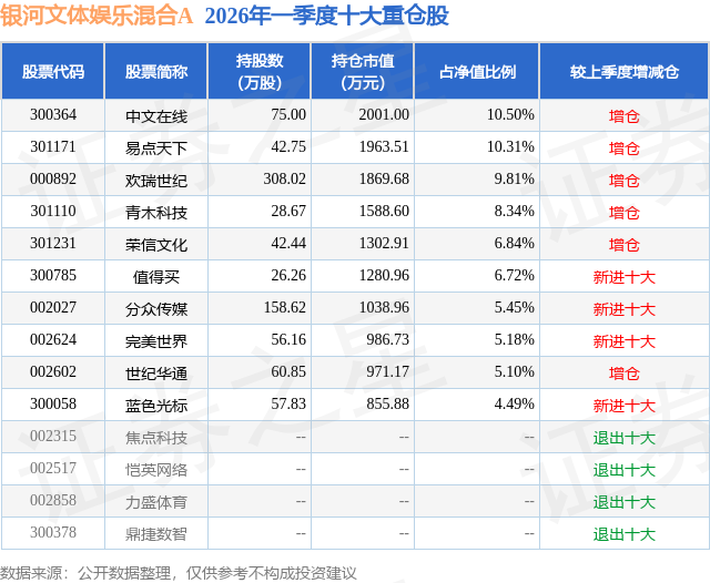 从基金规模来看,银河文体娱乐混合A基金2026年一季度公布的基金规模为0.81亿元,较上一期规模1.67亿元变化了-8626.01万元,环比变化了-51.62%。该基金最新一期资产配置为:股票占净值比90.08%,无债券类资产,现金占净值比19.09%。从基金持仓来看,该基金当季前十大股票仓位达72.74%,第一大重仓股为中文在线(300364),持仓占比为10.5%。