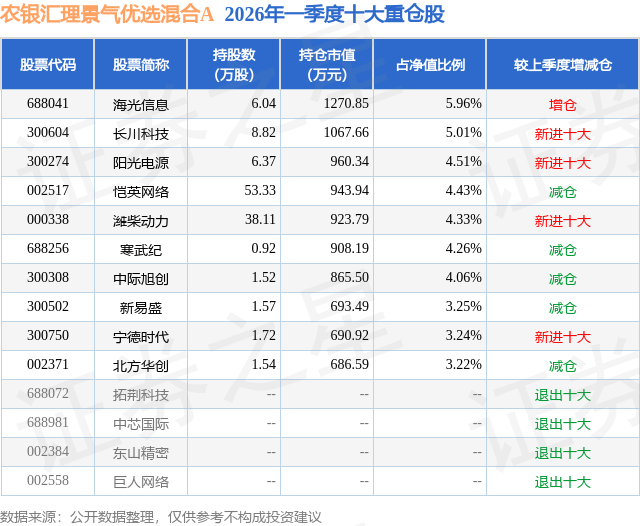 从基金规模来看,农银汇理景气优选混合A基金2026年一季度公布的基金规模为1.33亿元,较上一期规模2.23亿元变化了-9077.68万元,环比变化了-40.64%。该基金最新一期资产配置为:股票占净值比89.26%,无债券类资产,现金占净值比10.82%。从基金持仓来看,该基金当季前十大股票仓位达42.27%,第一大重仓股为海光信息(688041),持仓占比为5.96%。