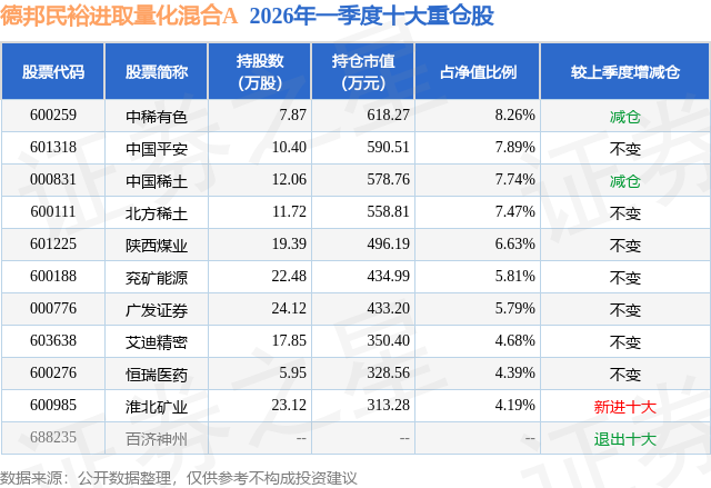 从基金规模来看,德邦民裕进取量化混合A基金2026年一季度公布的基金规模为0.67亿元,较上一期规模4960.28万元变化了1729.46万元,环比变化了34.87%。该基金最新一期资产配置为:股票占净值比90.82%,债券占净值比0.32%,现金占净值比9.13%。从基金持仓来看,该基金当季前十大股票仓位达62.85%,第一大重仓股为中稀有色(600259),持仓占比为8.26%。