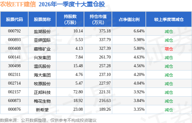 从基金规模来看,农牧ETF建信基金2026年一季度公布的基金规模为0.56亿元,较上一期规模5659.86万元变化了-12.09万元,环比变化了-0.21%。该基金最新一期资产配置为:股票占净值比99.07%,无债券类资产,现金占净值比1.25%。从基金持仓来看,该基金当季前十大股票仓位达46.96%,第一大重仓股为盐湖股份(000792),持仓占比为6.64%。
