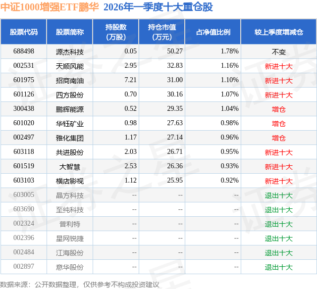 从基金规模来看,中证1000增强ETF鹏华基金2026年一季度公布的基金规模为0.28亿元,较上一期规模1970.29万元变化了854.98万元,环比变化了43.39%。该基金最新一期资产配置为:股票占净值比97.18%,无债券类资产,现金占净值比3.46%。从基金持仓来看,该基金当季前十大股票仓位达10.89%,第一大重仓股为源杰科技(688498),持仓占比为1.78%。