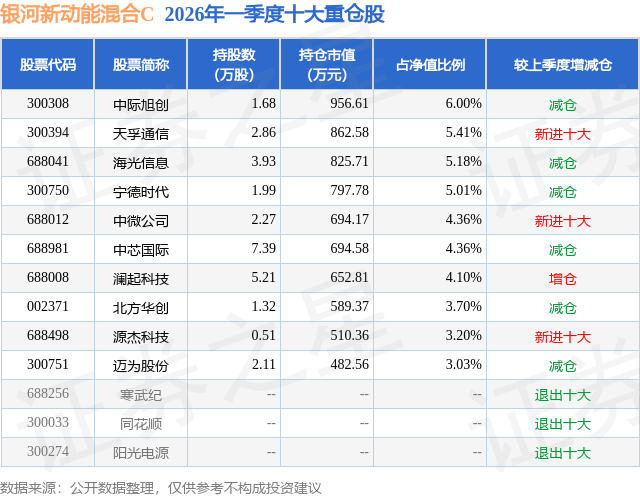 从基金规模来看,银河新动能混合C基金2026年一季度公布的基金规模为0.02亿元,较上一期规模146.84万元变化了4.51万元,环比变化了3.07%。该基金最新一期资产配置为:股票占净值比93.51%,无债券类资产,现金占净值比7.58%。从基金持仓来看,该基金当季前十大股票仓位达44.35%,第一大重仓股为中际旭创(300308),持仓占比为6.0%。