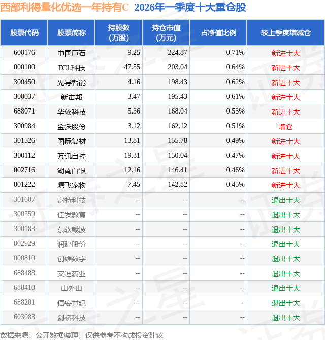 从基金规模来看,西部利得量化优选一年持有C基金2026年一季度公布的基金规模为0.7亿元,较上一期规模7631.76万元变化了-666.6万元,环比变化了-8.73%。该基金最新一期资产配置为:股票占净值比89.88%,无债券类资产,现金占净值比12.26%。从基金持仓来看,该基金当季前十大股票仓位达5.49%,第一大重仓股为中国巨石(600176),持仓占比为0.71%。
