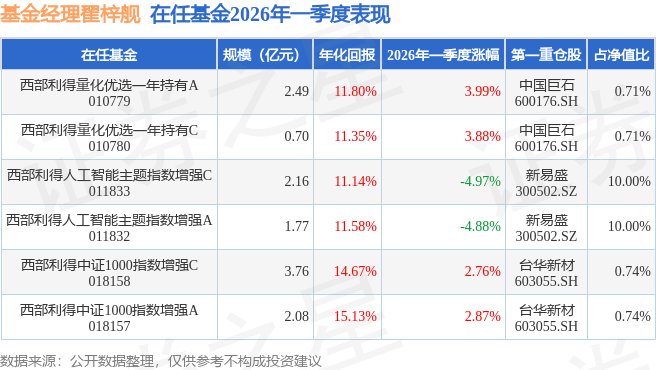 证券之星消息,日前西部利得量化优选一年持有C基金公布一季报,2026年一季度最新规模0.7亿元,季度净值涨幅为3.88%。