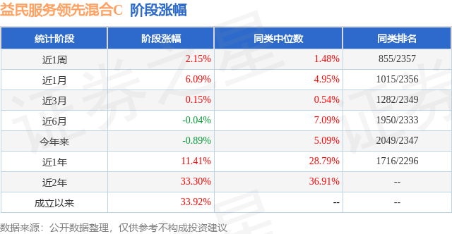 从业绩表现来看,益民服务领先混合C基金过去一年净值涨幅为11.41%,在同类基金中排名1716/2296,同类基金过去一年净值涨幅中位数为28.79%。而基金过去一年的最大回撤为-11.39%,成立以来的最大回撤为-11.39%。