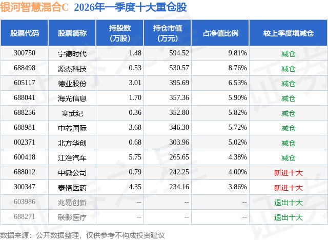 证券之星消息,日前银河智慧混合C基金公布一季报,2026年一季度最新规模0.0亿元,季度净值涨幅为0.38%。
