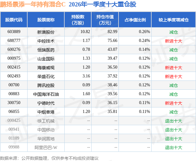 从基金规模来看,鹏扬景添一年持有混合C基金2026年一季度公布的基金规模为2.56亿元,较上一期规模5.97亿元变化了-3.41亿元,环比变化了-57.06%。该基金最新一期资产配置为:股票占净值比5.07%,债券占净值比107.7%,现金占净值比2.55%。从基金持仓来看,该基金当季前十大股票仓位达1.46%,第一大重仓股为新澳股份(603889),持仓占比为0.26%。