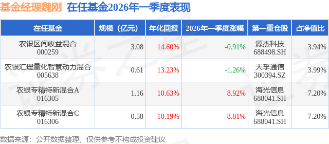 从基金规模来看,农银汇理量化智慧动力混合基金2026年一季度公布的基金规模为0.61亿元,较上一期规模7727.45万元变化了-1603.49万元,环比变化了-20.75%。该基金最新一期资产配置为:股票占净值比88.11%,无债券类资产,现金占净值比11.63%。从基金持仓来看,该基金当季前十大股票仓位达30.71%,第一大重仓股为天孚通信(300394),持仓占比为3.99%。