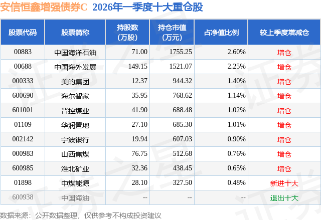从基金规模来看,安信恒鑫增强债券C基金2026年一季度公布的基金规模为2.32亿元,较上一期规模6.3亿元变化了-3.98亿元,环比变化了-63.23%。该基金最新一期资产配置为:股票占净值比18.62%,债券占净值比86.41%,现金占净值比3.85%。从基金持仓来看,该基金当季前十大股票仓位达12.21%,第一大重仓股为中国海洋石油(00883),持仓占比为2.6%。