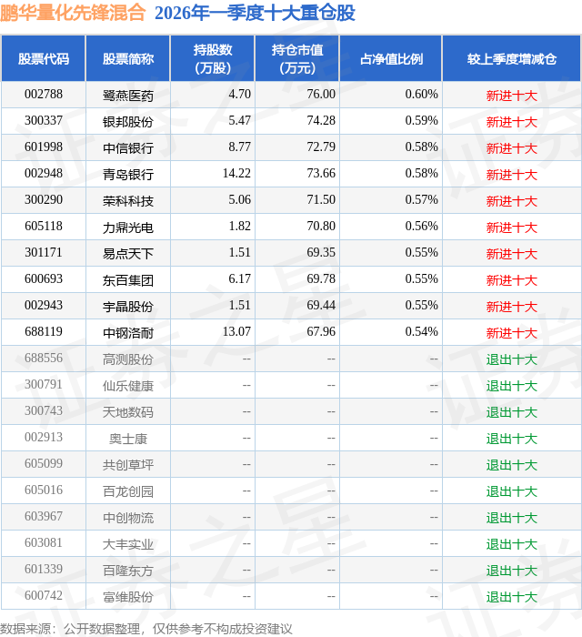 从基金规模来看,鹏华量化先锋混合基金2026年一季度公布的基金规模为1.26亿元,较上一期规模1.21亿元变化了468.24万元,环比变化了3.86%。该基金最新一期资产配置为:股票占净值比92.77%,无债券类资产,现金占净值比7.51%。从基金持仓来看,该基金当季前十大股票仓位达5.67%,第一大重仓股为鹭燕医药(002788),持仓占比为0.6%。