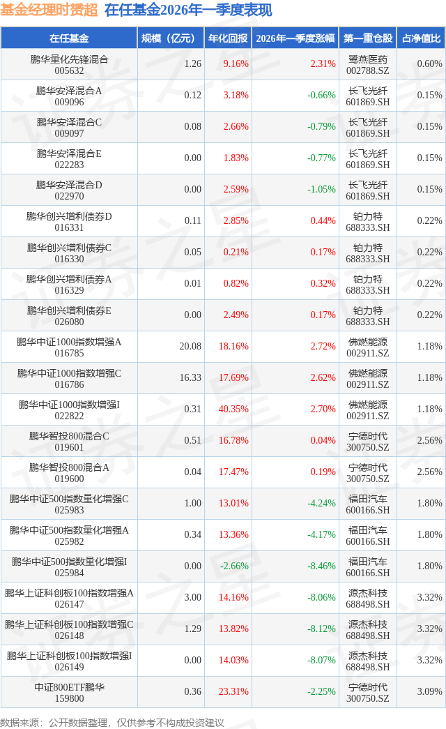 证券之星消息,日前鹏华量化先锋混合基金公布一季报,2026年一季度最新规模1.26亿元,季度净值涨幅为2.31%。