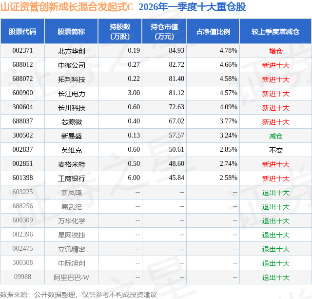 从基金规模来看,山证资管创新成长混合发起式C基金2026年一季度公布的基金规模为0.01亿元,较上一期规模13.7万元变化了120.77万元,环比变化了881.63%。该基金最新一期资产配置为:股票占净值比63.54%,无债券类资产,现金占净值比5.5%。从基金持仓来看,该基金当季前十大股票仓位达37.86%,第一大重仓股为北方华创(002371),持仓占比为4.78%。