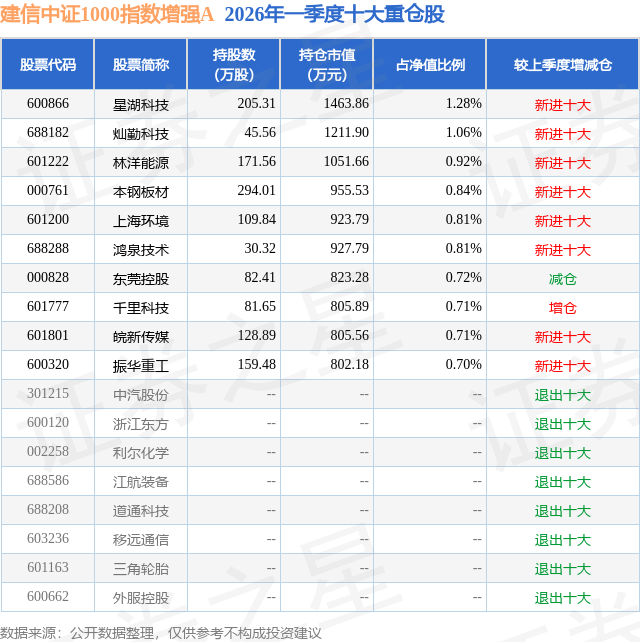 从基金规模来看,建信中证1000指数增强A基金2026年一季度公布的基金规模为6.11亿元,较上一期规模7.0亿元变化了-8893.69万元,环比变化了-12.71%。该基金最新一期资产配置为:股票占净值比85.7%,无债券类资产,现金占净值比13.57%。从基金持仓来看,该基金当季前十大股票仓位达8.56%,第一大重仓股为星湖科技(600866),持仓占比为1.28%。
