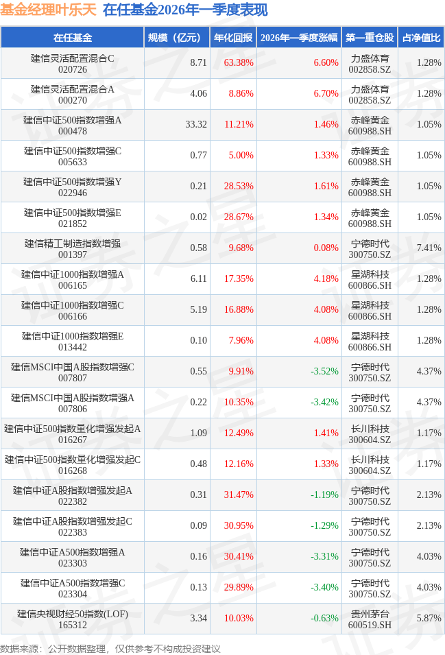 证券之星消息,日前建信中证1000指数增强A基金公布一季报,2026年一季度最新规模6.11亿元,季度净值涨幅为4.18%。