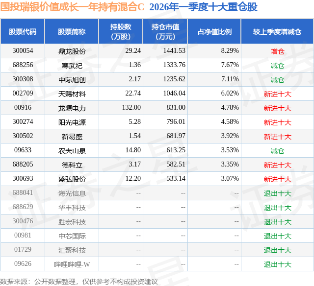 从基金规模来看,国投瑞银价值成长一年持有混合C基金2026年一季度公布的基金规模为0.12亿元,较上一期规模1758.53万元变化了-551.19万元,环比变化了-31.34%。该基金最新一期资产配置为:股票占净值比93.8%,无债券类资产,现金占净值比6.4%。从基金持仓来看,该基金当季前十大股票仓位达52.32%,第一大重仓股为鼎龙股份(300054),持仓占比为8.29%。