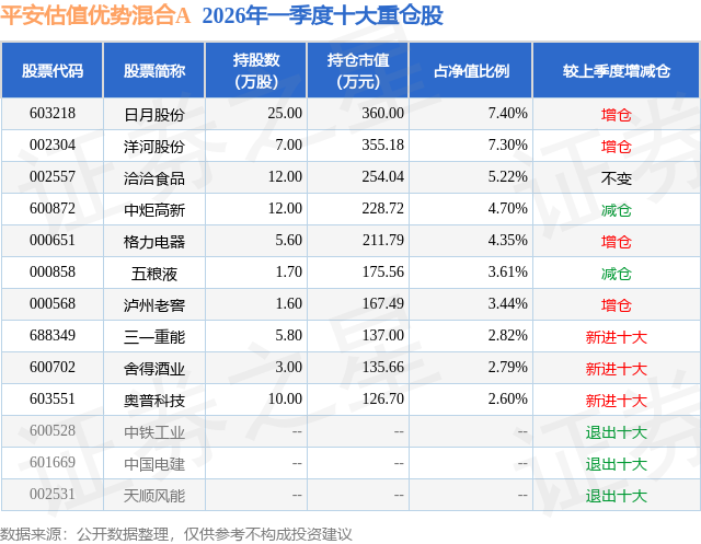 从基金规模来看,平安估值优势混合A基金2026年一季度公布的基金规模为0.02亿元,较上一期规模189.48万元变化了-30.68万元,环比变化了-16.19%。该基金最新一期资产配置为:股票占净值比76.84%,无债券类资产,现金占净值比7.86%。从基金持仓来看,该基金当季前十大股票仓位达44.23%,第一大重仓股为日月股份(603218),持仓占比为7.4%。