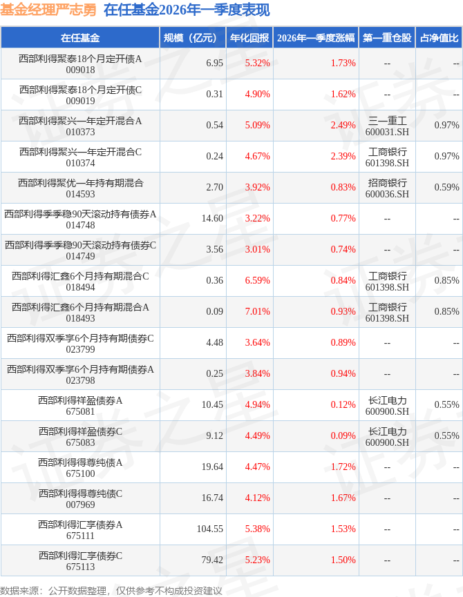 证券之星消息,日前西部利得聚优一年持有期混合基金公布一季报,2026年一季度最新规模2.7亿元,季度净值涨幅为0.83%。