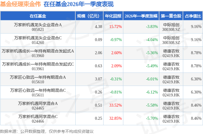证券之星消息,日前万家匠心致远一年持有期混合A基金公布一季报,2026年一季度最新规模3.07亿元,季度净值涨幅为-6.01%。