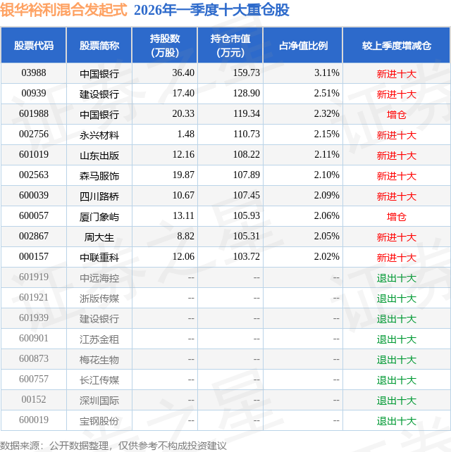 从基金规模来看,银华裕利混合发起式基金2026年一季度公布的基金规模为0.51亿元,较上一期规模9954.17万元变化了-4813.13万元,环比变化了-48.35%。该基金最新一期资产配置为:股票占净值比82.1%,债券占净值比0.98%,现金占净值比14.94%。从基金持仓来看,该基金当季前十大股票仓位达22.52%,第一大重仓股为中国银行(03988),持仓占比为3.11%。