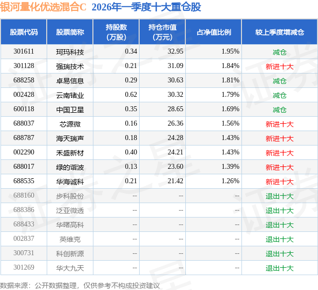 证券之星消息,日前银河量化优选混合C基金公布一季报,2026年一季度最新规模0.01亿元,季度净值涨幅为-2.65%。