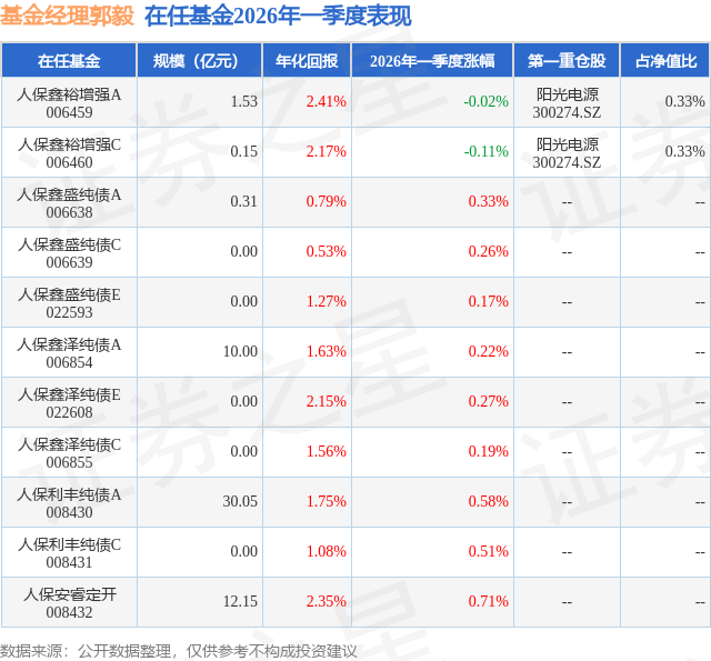 证券之星消息,日前人保鑫裕增强C基金公布一季报,2026年一季度最新规模0.15亿元,季度净值涨幅为-0.11%。