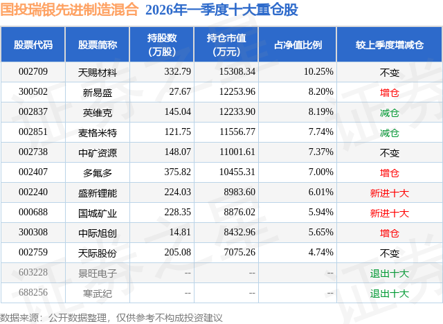 从基金规模来看,国投瑞银先进制造混合基金2026年一季度公布的基金规模为14.94亿元,较上一期规模14.89亿元变化了478.58万元,环比变化了0.32%。该基金最新一期资产配置为:股票占净值比93.05%,无债券类资产,现金占净值比6.83%。从基金持仓来看,该基金当季前十大股票仓位达71.09%,第一大重仓股为天赐材料(002709),持仓占比为10.25%。