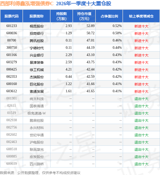 从基金规模来看,西部利得鑫泓增强债券C基金2026年一季度公布的基金规模为0.73亿元,较上一期规模3221.22万元变化了4124.33万元,环比变化了128.04%。该基金最新一期资产配置为:股票占净值比10.3%,债券占净值比80.93%,现金占净值比17.5%。从基金持仓来看,该基金当季前十大股票仓位达4.44%,第一大重仓股为桐昆股份(601233),持仓占比为0.52%。