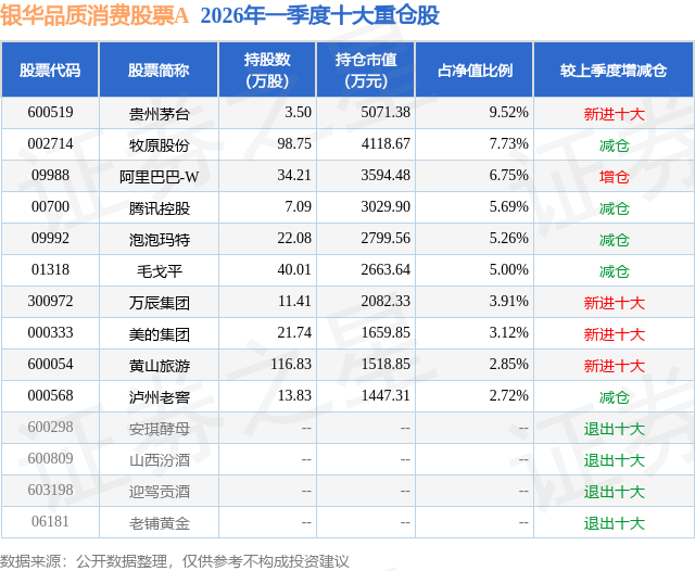 从基金规模来看,银华品质消费股票A基金2026年一季度公布的基金规模为3.84亿元,较上一期规模3.89亿元变化了-461.65万元,环比变化了-1.19%。该基金最新一期资产配置为:股票占净值比85.09%,无债券类资产,现金占净值比16.57%。从基金持仓来看,该基金当季前十大股票仓位达52.55%,第一大重仓股为贵州茅台(600519),持仓占比为9.52%。