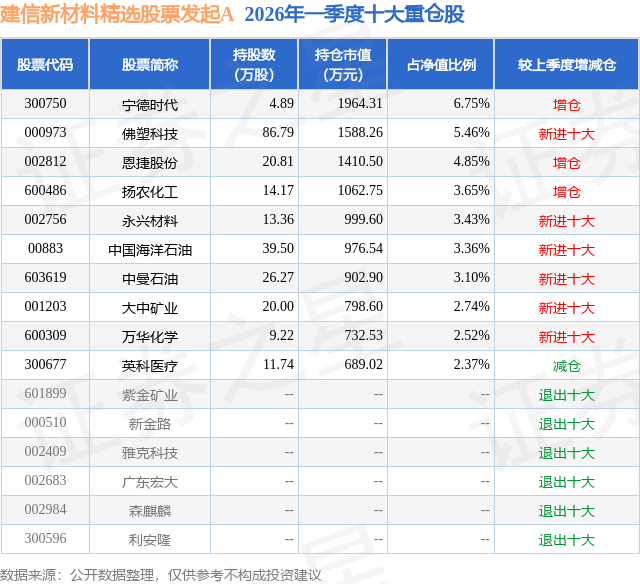从基金规模来看,建信新材料精选股票发起A基金2026年一季度公布的基金规模为1.54亿元,较上一期规模2841.14万元变化了1.26亿元,环比变化了443.44%。该基金最新一期资产配置为:股票占净值比84.65%,无债券类资产,现金占净值比17.08%。从基金持仓来看,该基金当季前十大股票仓位达38.23%,第一大重仓股为宁德时代(300750),持仓占比为6.75%。