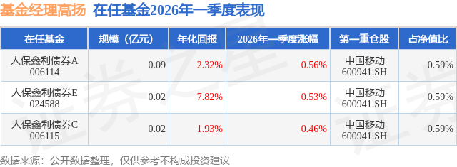 证券之星消息,日前人保鑫利债券C基金公布一季报,2026年一季度最新规模0.02亿元,季度净值涨幅为0.46%。
