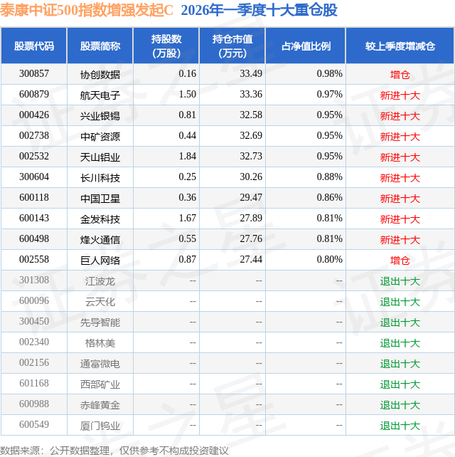 从基金规模来看,泰康中证500指数增强发起C基金2026年一季度公布的基金规模为0.13亿元,较上一期规模1034.5万元变化了236.36万元,环比变化了22.85%。该基金最新一期资产配置为:股票占净值比89.46%,无债券类资产,现金占净值比10.16%。从基金持仓来看,该基金当季前十大股票仓位达8.96%,第一大重仓股为协创数据(300857),持仓占比为0.98%。