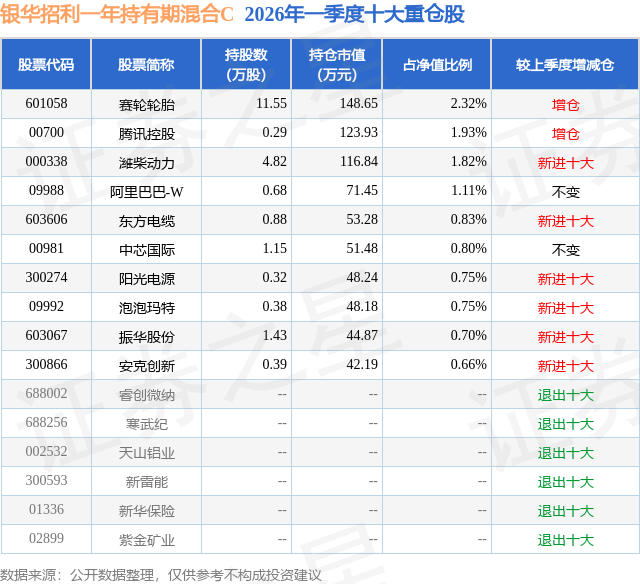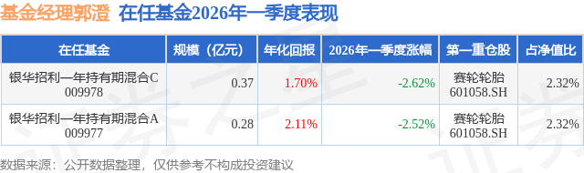 证券之星消息,日前银华招利一年持有期混合C基金公布一季报,2026年一季度最新规模0.37亿元,季度净值涨幅为-2.62%。