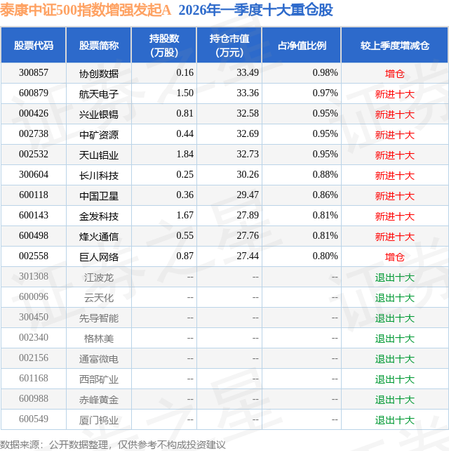 证券之星消息,日前泰康中证500指数增强发起A基金公布一季报,2026年一季度最新规模0.22亿元,季度净值涨幅为1.72%。