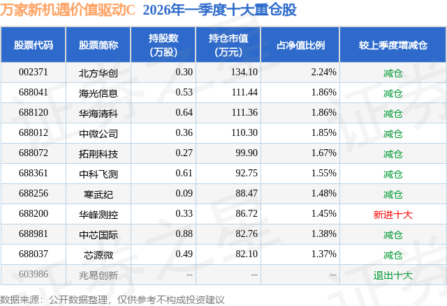 从基金规模来看,万家新机遇价值驱动C基金2026年一季度公布的基金规模为0.13亿元,较上一期规模2307.28万元变化了-996.1万元,环比变化了-43.17%。该基金最新一期资产配置为:股票占净值比28.67%,无债券类资产,现金占净值比29.45%。从基金持仓来看,该基金当季前十大股票仓位达16.71%,第一大重仓股为北方华创(002371),持仓占比为2.24%。