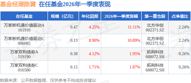 证券之星消息,日前万家新机遇价值驱动C基金公布一季报,2026年一季度最新规模0.13亿元,季度净值涨幅为10.89%。