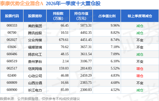 从基金规模来看,泰康优势企业混合A基金2026年一季度公布的基金规模为4.25亿元,较上一期规模7.87亿元变化了-3.62亿元,环比变化了-46.0%。该基金最新一期资产配置为:股票占净值比91.94%,债券占净值比6.0%,现金占净值比1.06%。从基金持仓来看,该基金当季前十大股票仓位达67.44%,第一大重仓股为美的集团(000333),持仓占比为9.96%。
