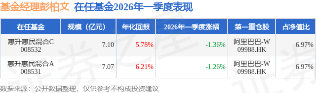 从基金规模来看,惠升惠民混合C基金2026年一季度公布的基金规模为7.1亿元,较上一期规模8168.63万元变化了6.29亿元,环比变化了769.57%。该基金最新一期资产配置为:股票占净值比83.56%,债券占净值比0.7%,现金占净值比9.91%。从基金持仓来看,该基金当季前十大股票仓位达47.11%,第一大重仓股为阿里巴巴-W(09988),持仓占比为6.97%。