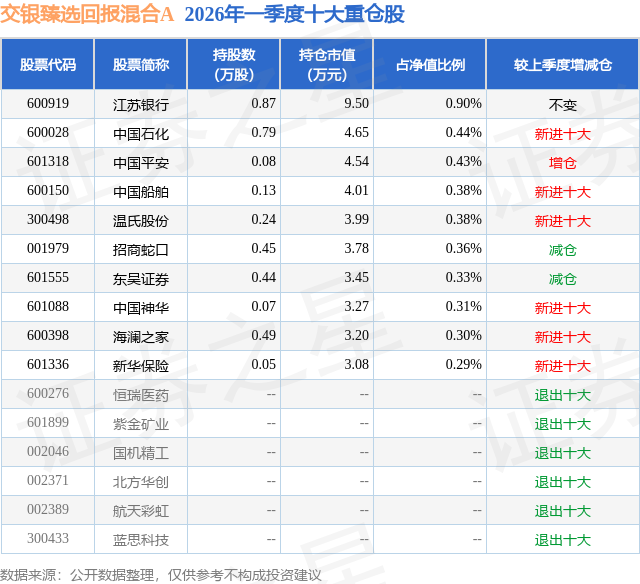 证券之星消息,日前交银臻选回报混合A基金公布一季报,2026年一季度最新规模0.1亿元,季度净值涨幅为0.12%。