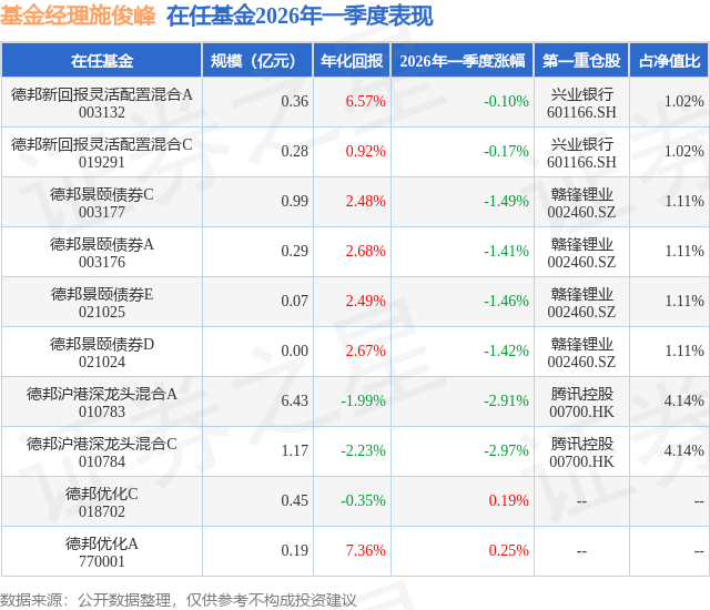 证券之星消息,日前德邦沪港深龙头混合A基金公布一季报,2026年一季度最新规模6.43亿元,季度净值涨幅为-2.91%。
