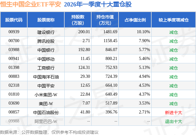 从基金规模来看,恒生中国企业ETF平安基金2026年一季度公布的基金规模为1.47亿元,较上一期规模5.06亿元变化了-3.59亿元,环比变化了-71.01%。该基金最新一期资产配置为:股票占净值比91.08%,无债券类资产,现金占净值比11.16%。从基金持仓来看,该基金当季前十大股票仓位达54.44%,第一大重仓股为建设银行(00939),持仓占比为10.1%。