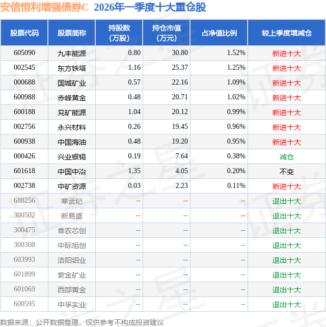 从基金规模来看,安信恒利增强债券C基金2026年一季度公布的基金规模为0.19亿元,较上一期规模3747.11万元变化了-1864.91万元,环比变化了-49.77%。该基金最新一期资产配置为:股票占净值比8.54%,债券占净值比84.25%,现金占净值比1.33%。从基金持仓来看,该基金当季前十大股票仓位达8.47%,第一大重仓股为九丰能源(605090),持仓占比为1.52%。