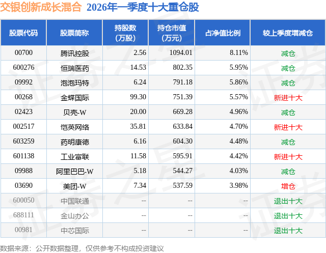 从基金规模来看,交银创新成长混合基金2026年一季度公布的基金规模为1.35亿元,较上一期规模1.17亿元变化了1777.16万元,环比变化了15.17%。该基金最新一期资产配置为:股票占净值比88.8%,无债券类资产,现金占净值比14.6%。从基金持仓来看,该基金当季前十大股票仓位达52.06%,第一大重仓股为腾讯控股(00700),持仓占比为8.11%。