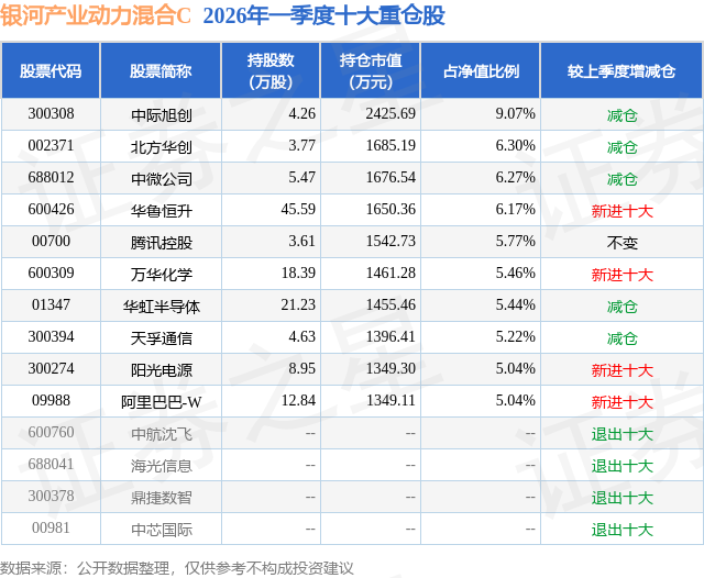 从基金规模来看,银河产业动力混合C基金2026年一季度公布的基金规模为0.02亿元,较上一期规模116.24万元变化了99.81万元,环比变化了85.86%。该基金最新一期资产配置为:股票占净值比92.09%,无债券类资产,现金占净值比8.55%。从基金持仓来看,该基金当季前十大股票仓位达59.78%,第一大重仓股为中际旭创(300308),持仓占比为9.07%。