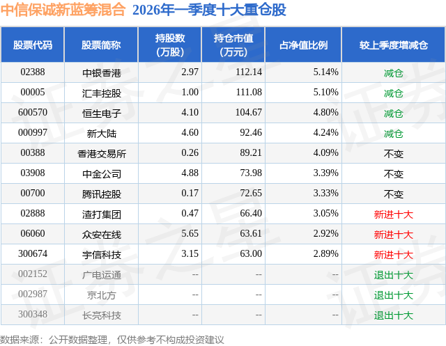 从基金规模来看,中信保诚新蓝筹混合基金2026年一季度公布的基金规模为0.22亿元,较上一期规模3696.27万元变化了-1516.5万元,环比变化了-41.03%。该基金最新一期资产配置为:股票占净值比91.13%,无债券类资产,现金占净值比8.74%。从基金持仓来看,该基金当季前十大股票仓位达38.95%,第一大重仓股为中银香港(02388),持仓占比为5.14%。