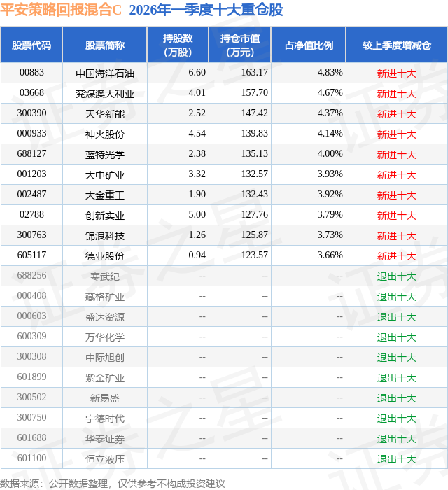从基金规模来看,平安策略回报混合C基金2026年一季度公布的基金规模为0.1亿元,较上一期规模2289.15万元变化了-1320.9万元,环比变化了-57.7%。该基金最新一期资产配置为:股票占净值比90.02%,无债券类资产,现金占净值比10.34%。从基金持仓来看,该基金当季前十大股票仓位达41.04%,第一大重仓股为中国海洋石油(00883),持仓占比为4.83%。